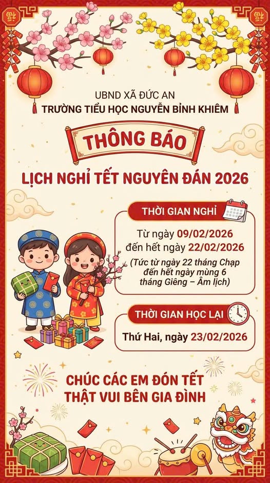 Thực hiện kế hoạch năm học, nhà trường thông báo tới toàn thể cán bộ, giáo viên, nhân viên và học sinh về thời gian nghỉ Tết Nguyên đán.